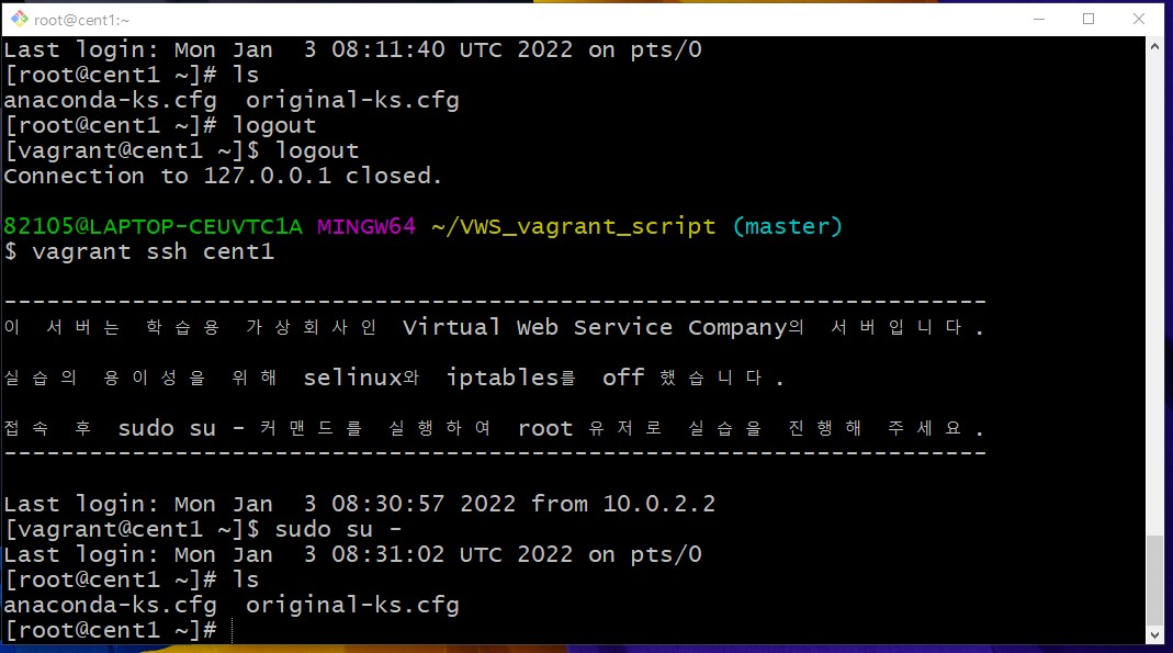 /root 하위의 파일을 확인 해 보시고 SHELL과 WORK 디렉토리가 없다면 mkdir로 만들어주세요. ## root 유저로 접속한 후에 다음 명령을 실행 ls -al /root/ --> 실행 결과 WORK 또는 SHELL 디렉토리가 없다면 다음을 실행 mkdir /root/WORK /root/SHELL
