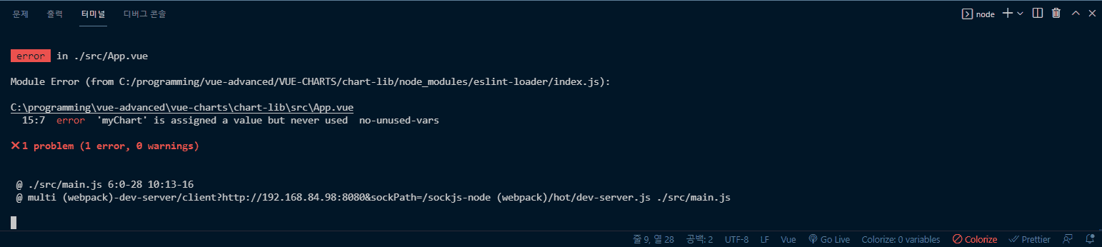 안녕하세요 뷰린이님, 제가 답변이 좀 늦었네요 :) 해당 오류는 변수 선언 후 사용하지 않아서 나는 ESLint 에러입니다. 동작과는 크게 상관 없기 때문에 무시하시고 진행하셔도 됩니다 :)