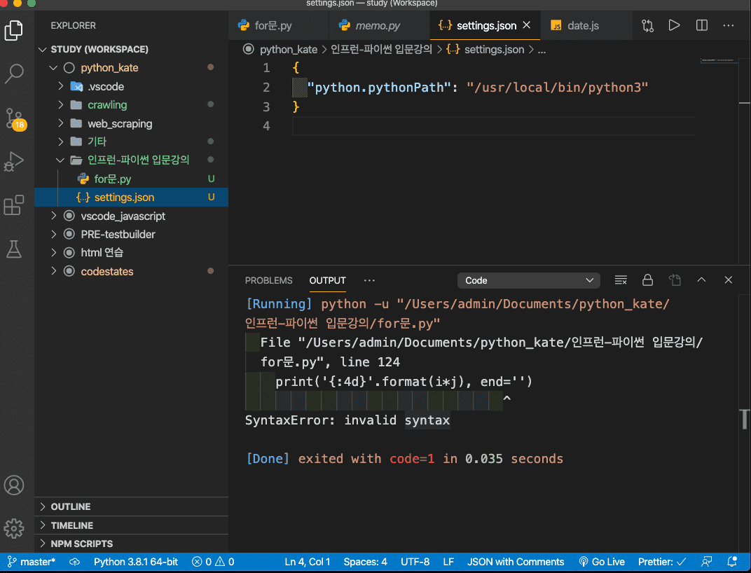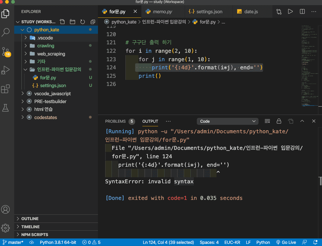 print('{:4d}'.format(i*j), end='') 이부분이 에러가 나서 ㄷ른 분 답변을 보니 파이썬을 3으로 하면 된다고 했는데.. 제가 사용하는 vscode 아래 부분에 python3.81 이라고 나오는데요. .. 전 여전히 에러 메시지가 나는데 그 이유는 뭘까요?