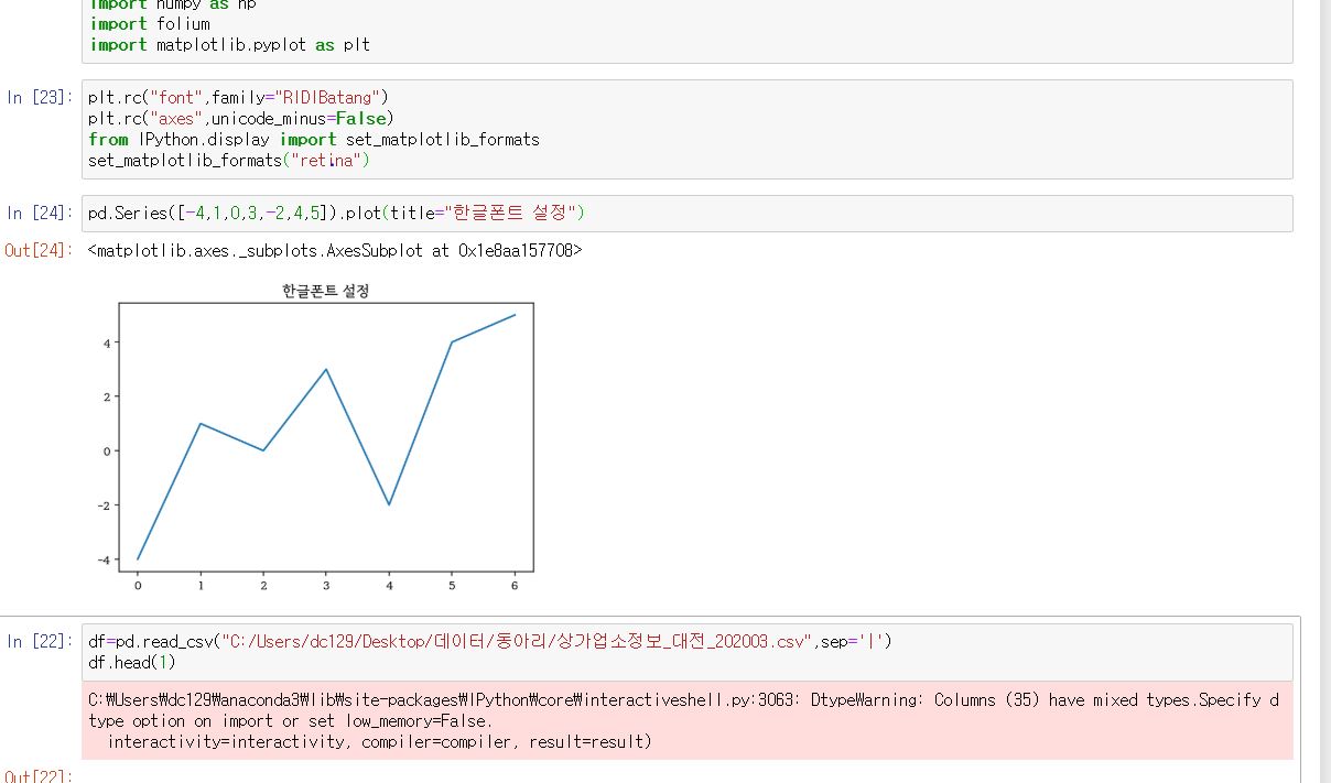 예를 들어 sns.set()과 같은 코드가 중간에 들어가게 되면 폰트 설정이 초기화 됩니다.