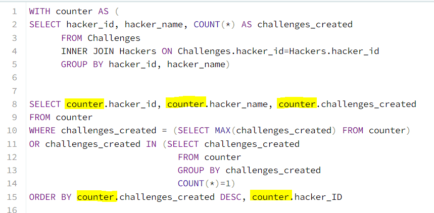 영상에서 (18:00~) WITH문을 사용해서 문제 푸는 법을 설명해주셨는데, 하기 이미지에서 하이라이트한 counter를 모두 생략해도 같은 답이 나오나요?