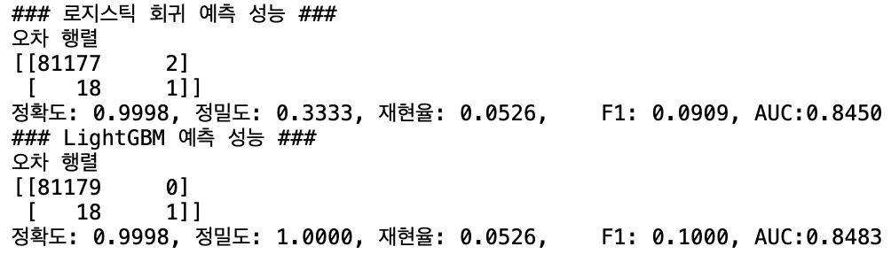 outlier_index = get_outlier(df=card_df, column='V14', weight=1.5)로 출력해보시면 너무 많은 데이터가 이상치로 설정됩니다. outlier 제거는 가능한 최소치로 해주셔야 합니다. 전체 데이터를 IQR로 하면 실제 사기 데이터에 잘 동작하는 데이터도 삭제 시켜버리고 있습니다.
