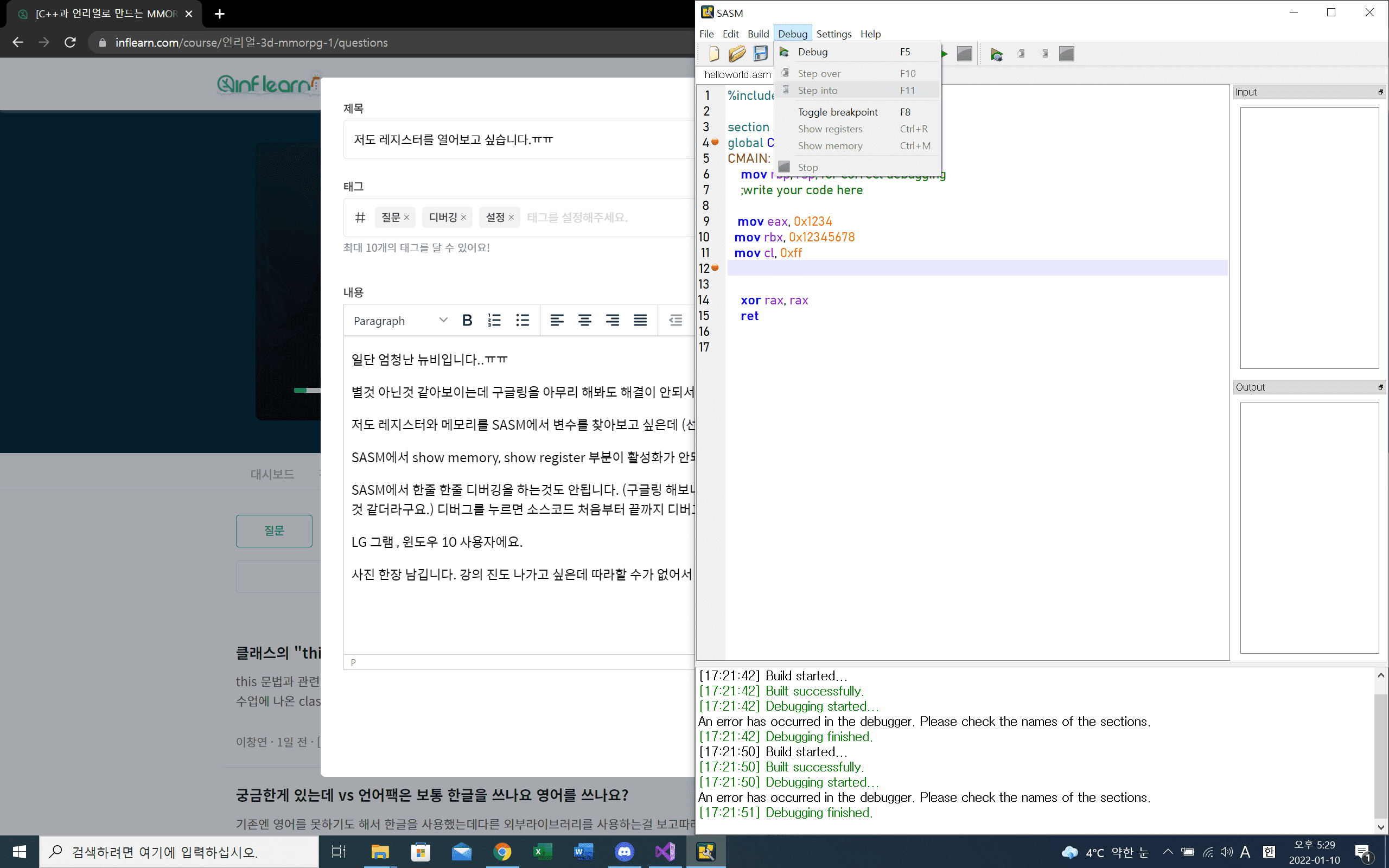 SASM에서 한줄 한줄 디버깅을 하는것도 안됩니다. (구글링 해보니 이게 해결되면 show memory , show register가 활성화 될것 같더라구요.) 디버그를 누르면 소스코드 처음부터 끝까지 디버그 하고 끝났다고 표시됩니다.