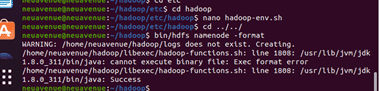 화면에서 볼 때 하둡 경로 (home/neuavenue/hadoop)에 대한 처리가 불충분한 것 같네요. 포멧이 안되는 이유는 하둡 설치하면서 경로 설정 문제이거나 자바 세팅 설정에 문제가
