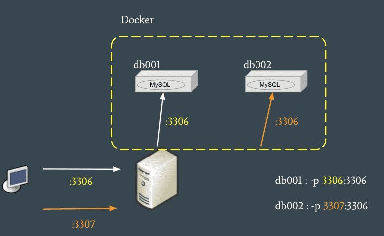 위와 같이 매핑된 경우에는 docker host로 3307 포트로 입력되는 트래팩은 db002 container의