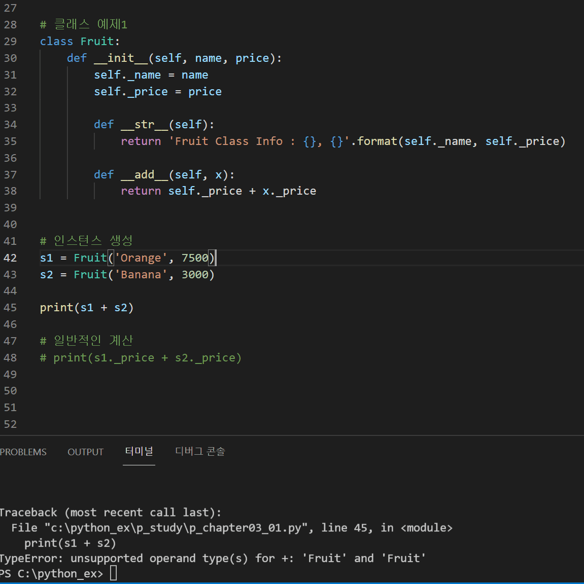 클래스 안에 들여쓰기가 __add__ , __str__ 메소드 구현이 __init__ 하고 같아야 되요