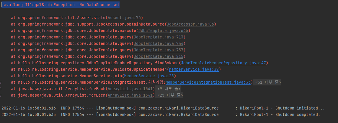스프링 입문 강의에서 jdbctemplate따라하는 부분에서 오류가 발생했는데, 해결이 안됩니다.