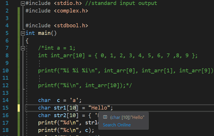 char str1[10] = "Hello";에서 str1를 str1[10]으로, 대괄호[]안에 공간(원소)를 10개 가지고 있음으로 해당 사진처럼 나오는 것이 맞습니다.