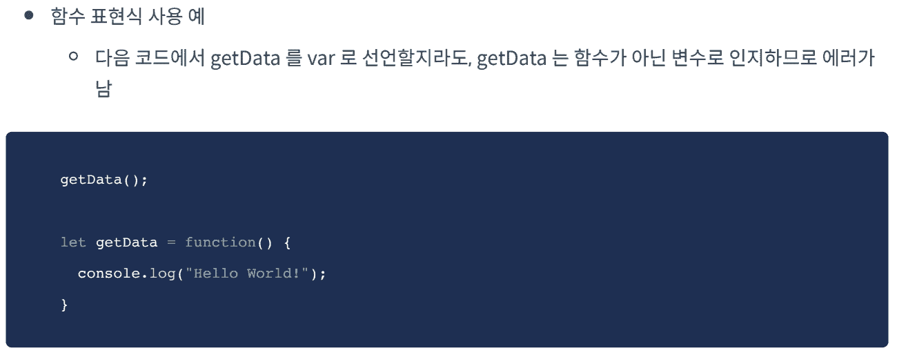 var을 사용하면 호이스팅 이슈가 일어나 var getData; 가 가장 먼저 변수로 선언이 되는데, 이후의 코드에서 getData();로 함수처럼 사용하기 때문에 에러가 난다고 이해했습니다.