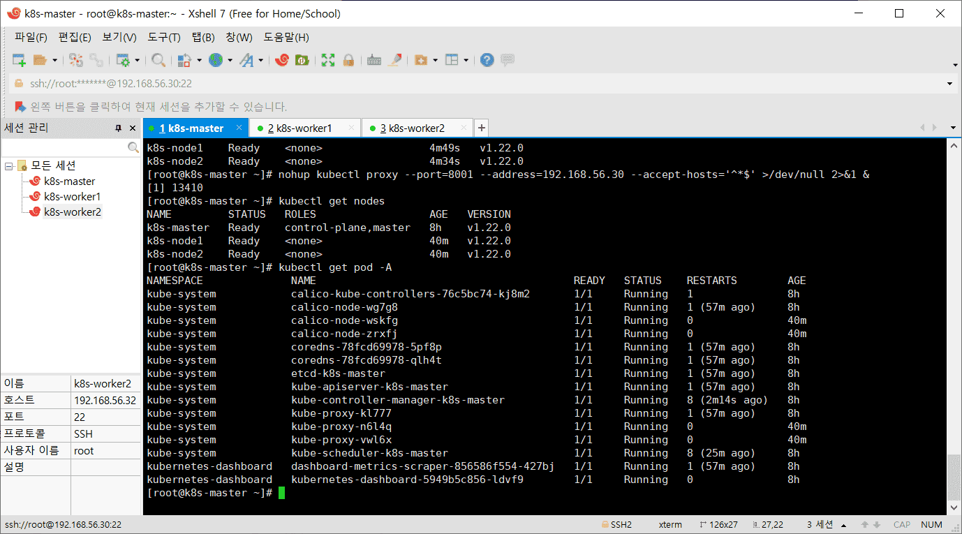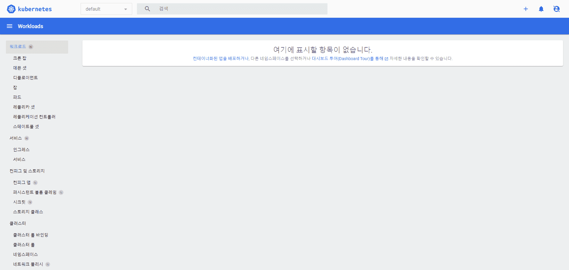이 명령어에선 다 Running으로 나오는데, 대시보드의 워크로드에 "여기에 표시할 항목이 없다"라는 문제였습니다 ㅎ