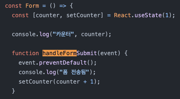 와 답변 감사합니다. 리렌더링을 통해 Form코드가 다시 재실행되는군요. 다만 이해가 안가는건 콘솔이 찍히기 전에 다시 counter가 정의되서 1이 될것같은데 그건 리액트 내부 로직에 의해서 막나보네요. 유추한게 맞을까요?