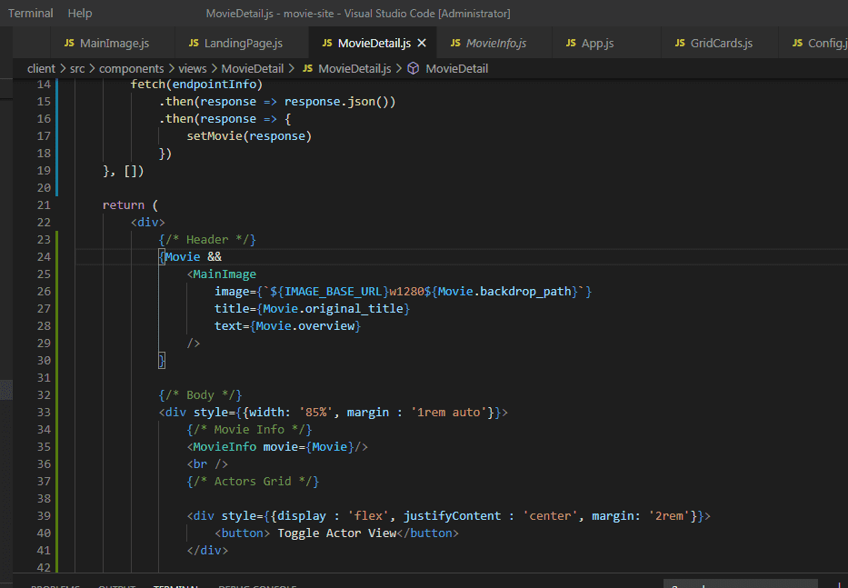 이런 에러가 자꾸 뜨길래 아래와 같이 { Movie &&  < MainImage ~~~ } 로 Movie가 있을 경우에만 수행하게끔 했는데, 똑같은 에러가 뜨길래 {Movie.backdrop_path && ~~ }로 고치니까 에러가 없어지더라구요!