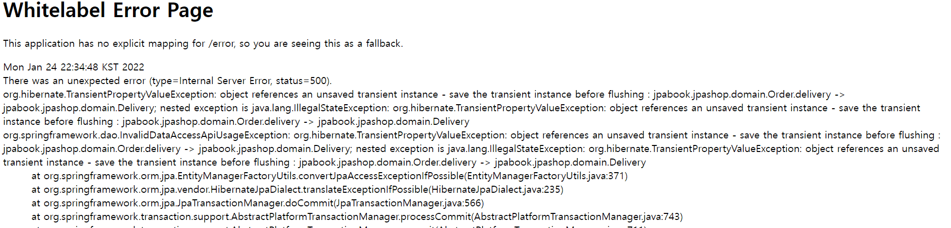 상품주문에서 다 입력하고 submit제출하면 이렇게 오류가 뜹니다. 회원과 상품 정상적으로 입력되어있구요. 주문 내역 페이지도 뜨긴하는데 정상적으로 작동하는지 모르겠습니다. (상품 주문에서 오류가떠서..)