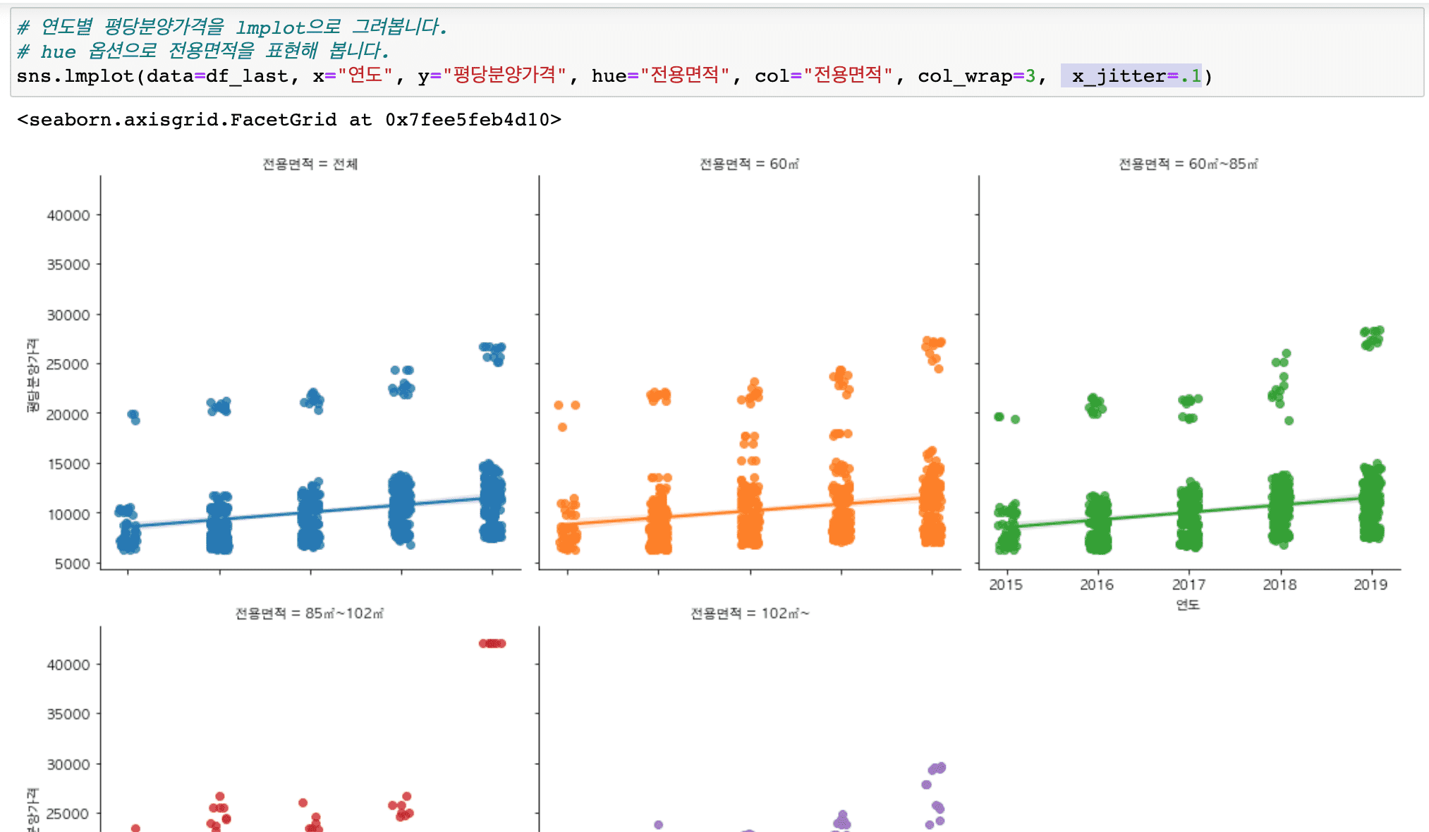 [13/20] scatterplot, regplot, lmplot, swarmplot 의 차이를 분양가 데이터 시각화로 이해하기