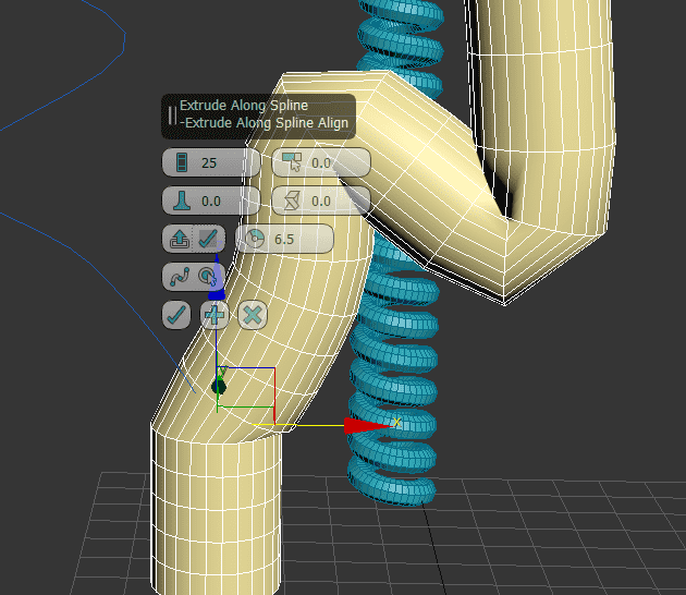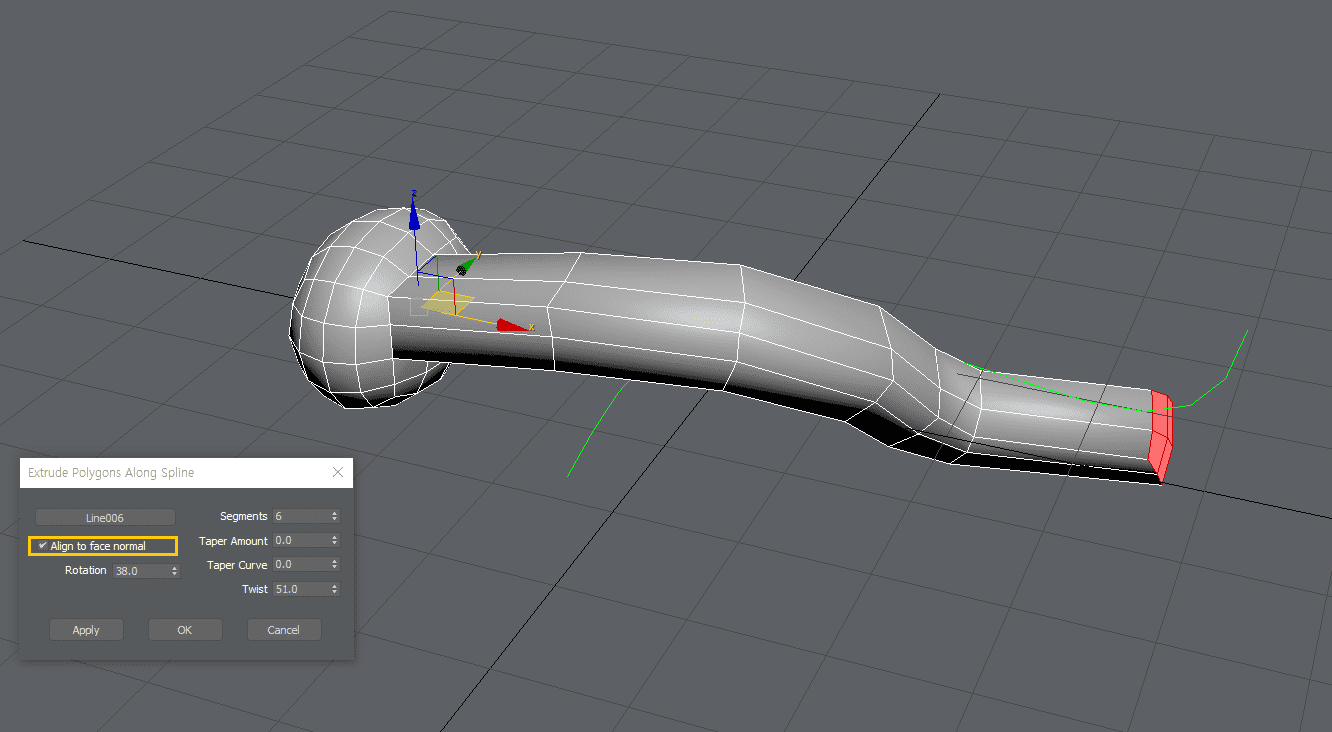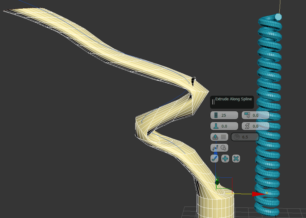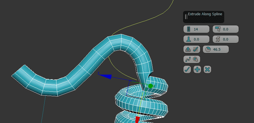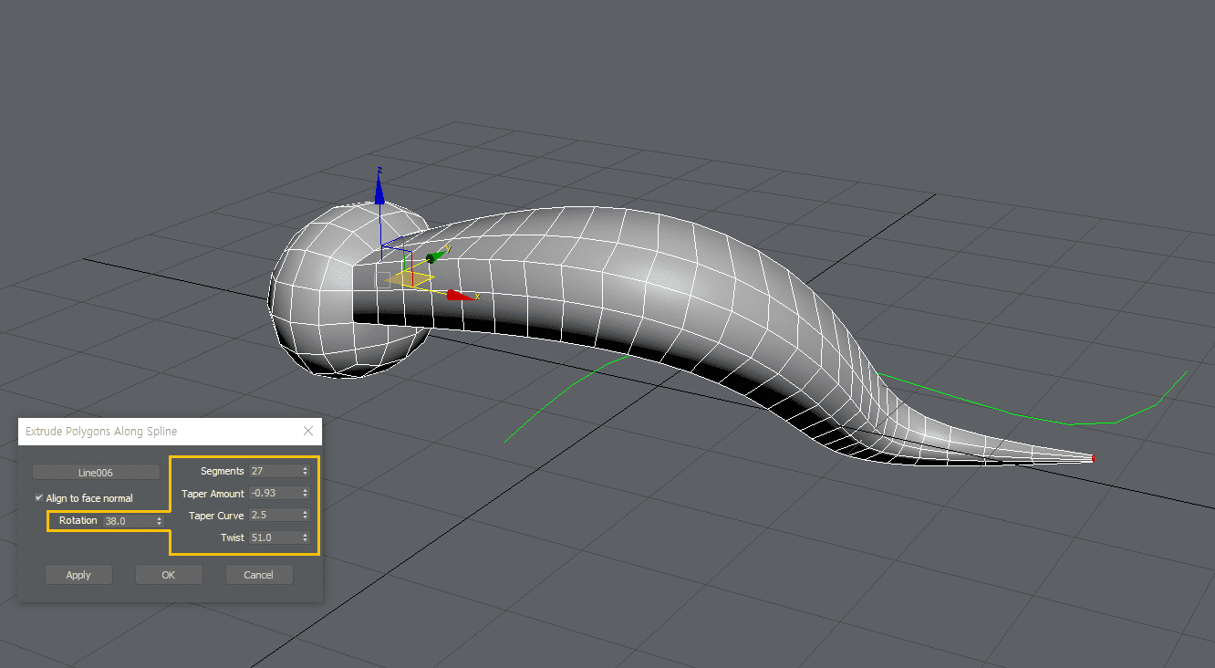 extrude along spline은 머리카락이나 유기체 모델링에 매우 효율적으로 사용할 수 있는 기능입니다.