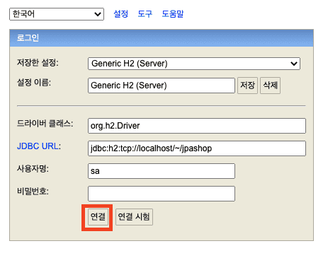 Server 로 JDBC URL : jdbc:h2:tcp://localhost/~/jpashop 로 연결하여 작업한다.
