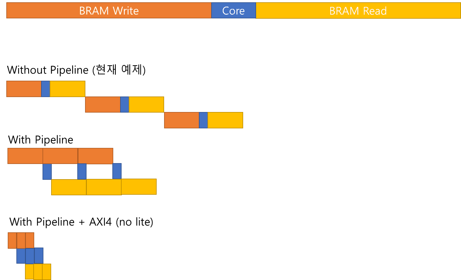 BRAM에 Write, Core Run, BRAM에 Read 관점에서 보았을때, Pipeline 이 미적용되어 있습니다.