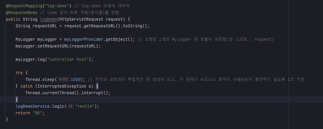 MyLogger이 없습니다. 이 때 myLoggerProvider는 request에 대응하는 MyLogger을 컨트롤러에게 요청하고 컨트롤러는 이를 생성하고, 빈 스코프에 맞게 요청이 끝날 때까지 이 빈의 라이프 사이클을 관리해줍니다.