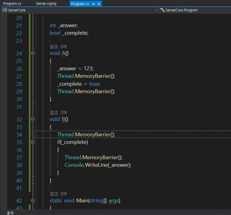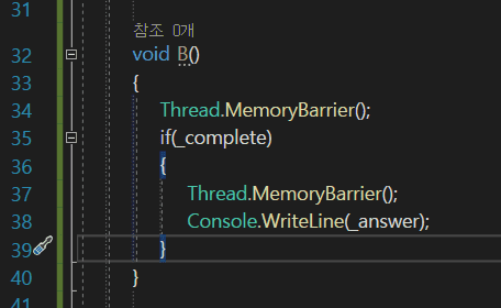 멀티 쓰레드 환경이면 B는 실행을 하여도 A쓰레드에서 _complete를 true로 바꾸기전에