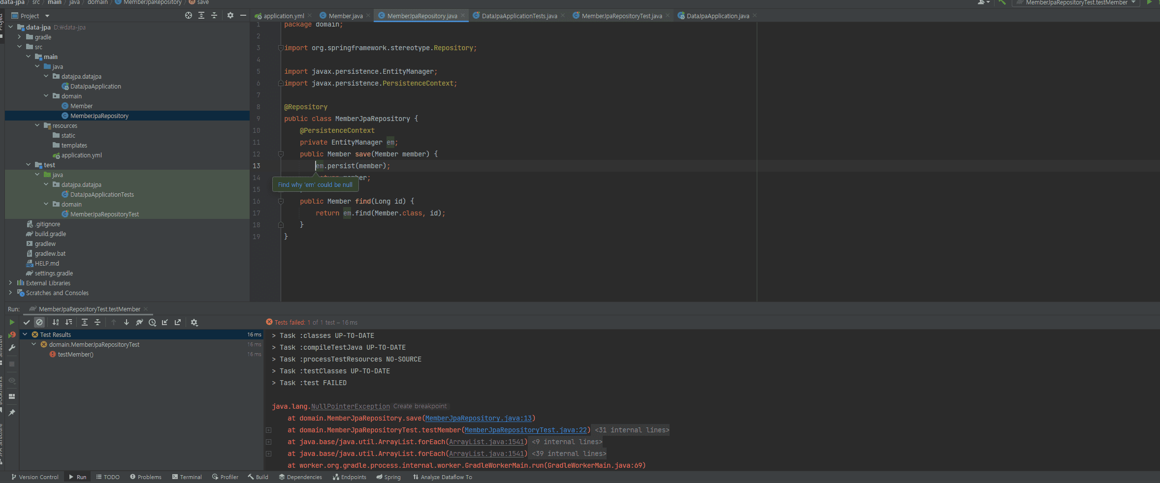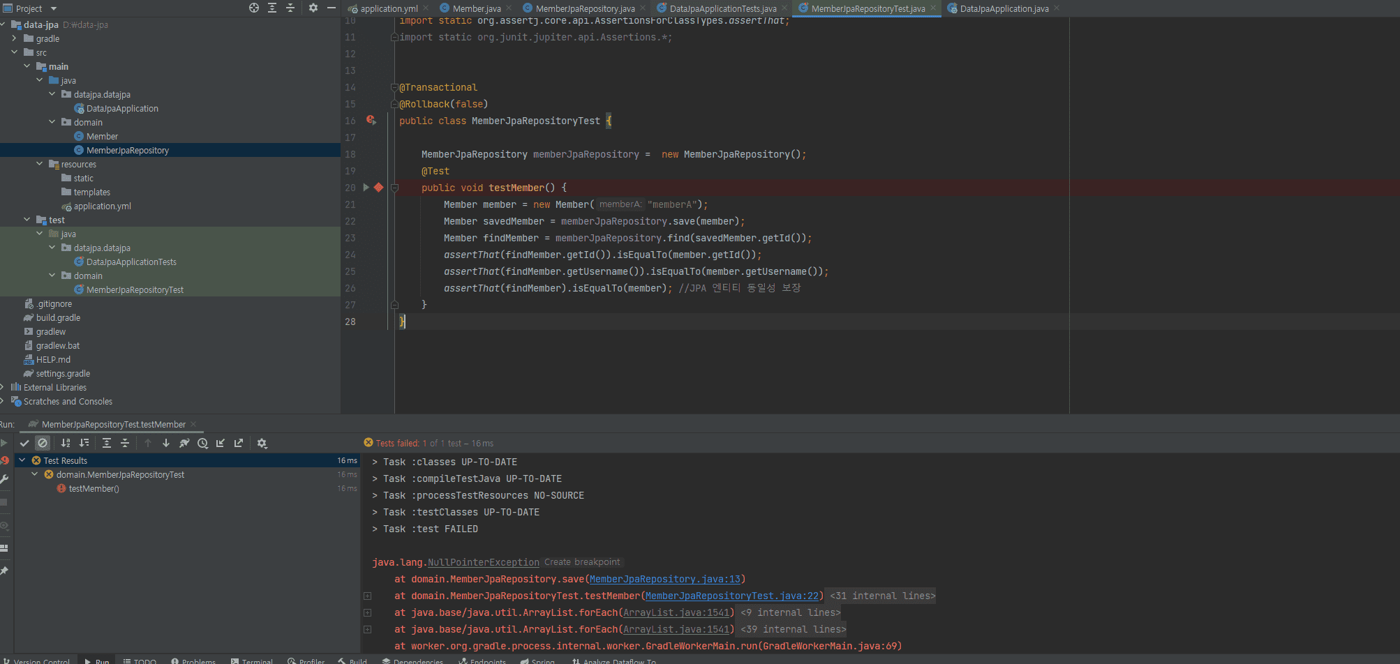 main과 test 패키지 내 각각의 domain 패키지를 datajpa.datajpa 패키지 아래에 위치시켜주세요.