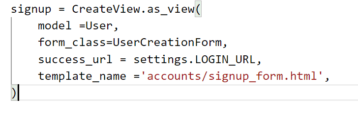 signup 뷰에 지정된 success_url 은 지정된 Form 처리가 성공적으로 끝났을 때 이동하는 주소입니다. success_url 로 지정된 값은 settings.LOGIN_URL 인데요. 이 값의 디폴트 값은 "/accounts/login/" 입니다.