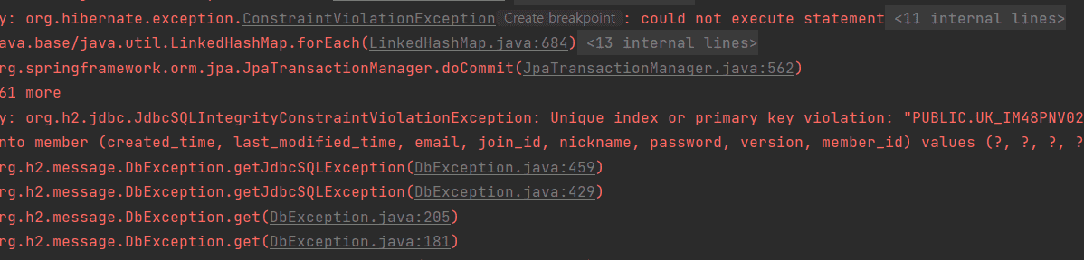 Caused by: org.h2.jdbc.JdbcSQLIntegrityConstraintViolationException: Unique index or primary key violation: "PUBLIC.UK_IM48PNV02C18VQLPRLYQC0UAR_INDEX_8 ON PUBLIC.MEMBER(JOIN_ID) VALUES 1"; SQL statement: