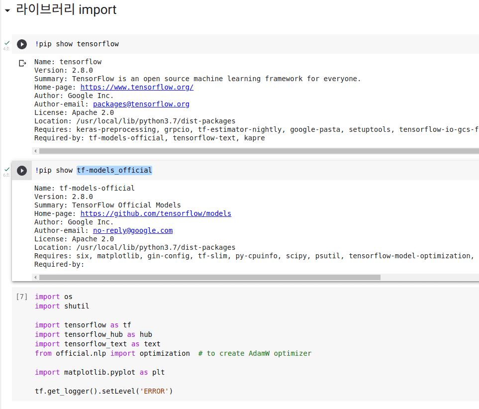 !pip install -q tf-models-official이 정상적으로 설치되었습니다.