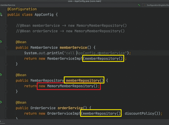 =>말씀하신 부분이 이런 상황 아니신가요? 등록한 빈(MemoryMemberRepository)를 MemberServiceImpl에서도 사용하고, OrderServiceImpl에서도 사용하고 있습니다.