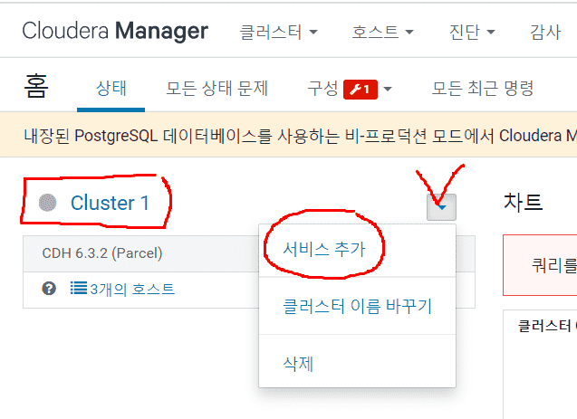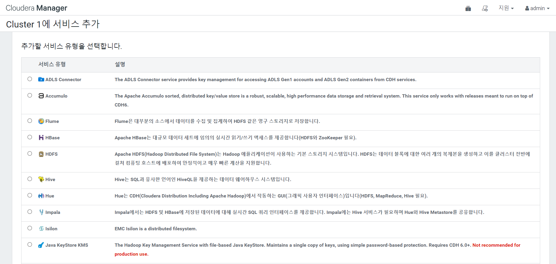 알려주신대로 Cloudera Manager 홈으로 이동해서 Cluster1의 서비스 추가를 진행해보니, "CDH 버젼 선택 및 추가 Parcel 선택" 창으로 곧바로 이동하는 것이 아니라 아래와 같은 창이 뜹니다...