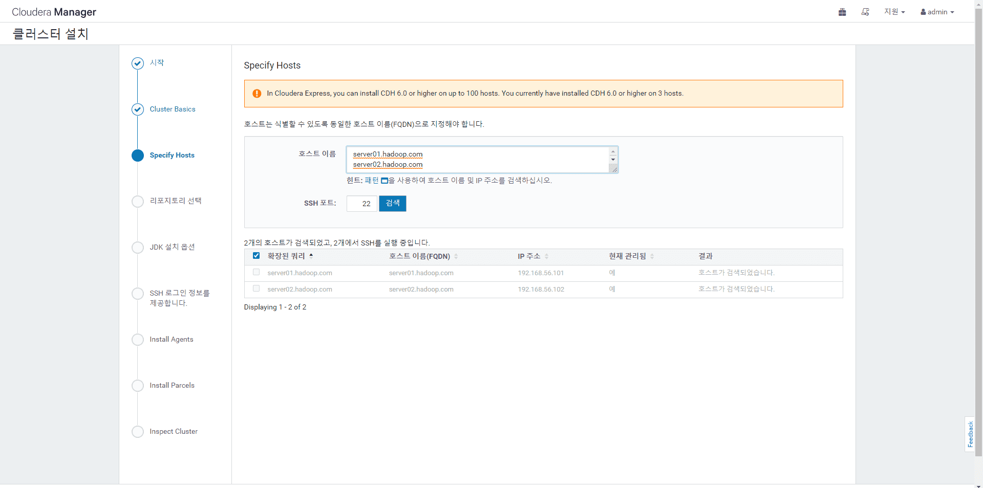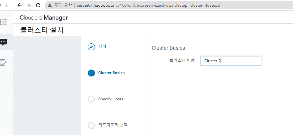 고사양 환경의 경우 아래 그림에서 보시는것처럼, 곧바로 Cloudera Manager 홈으로 이동해서 Cluster1의 서비스 추가를 진행 하시면, 강의 내용에서 보시는 "CDH 버젼 선택 및 추가 Parcel 선택" 창으로 곧바로 이동하게 됩니다.