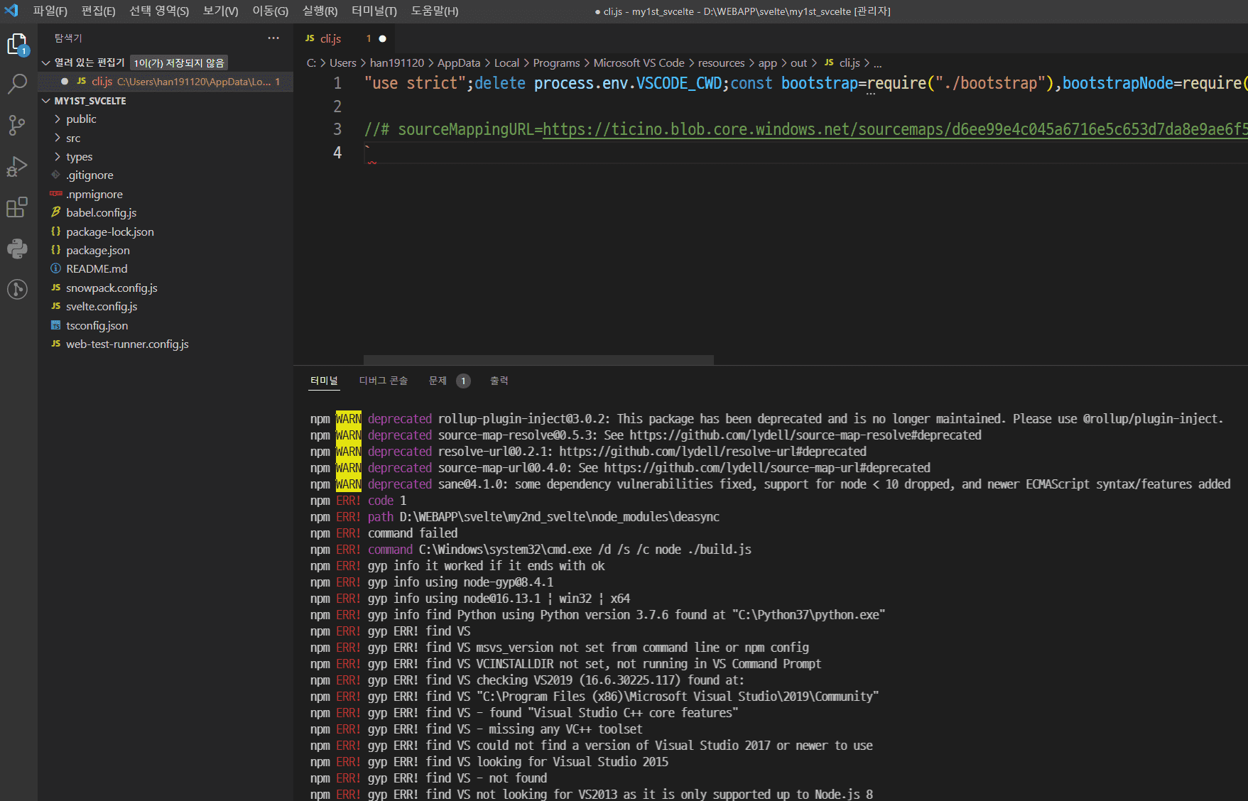 그런데 svelte 공식 홈피에서 제공하는 기본 팩은 설치 후 잘 됩니다