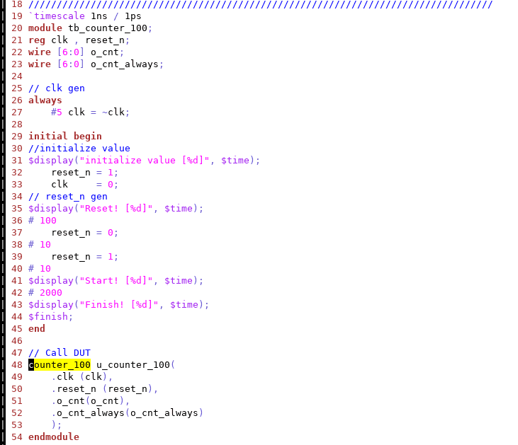 instantiataion이 되어있는 것은 알고있습니다. 그런데 tb_counter_100.v 파일 내에는 그 module의 정의가 없습니다. 예를들어 a.c 파일에서 어떤 함수를 사용하는데 그 함수의 declaration(선언)만 되어있고, definition(정의)은 다른 파일(b.c)에 되어있는데 어떻게 그 함수를 a.c파일에서 사용할 수 있는가라는 잘문입니다.