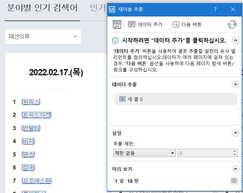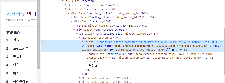 해결방안으로는 키워드(1  원피스) 값을 데이터 스크래핑 후 split을 사용하여 줄바꿈 문자(chr(10))를 구분하여  '1'과 '원피스' 문자를 따로 DT에 저장하는 방법이 있습니다.