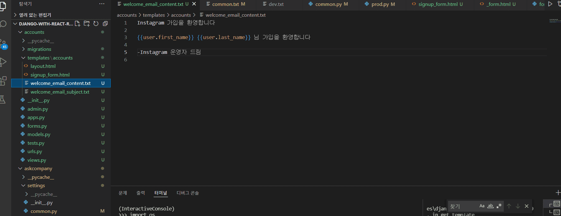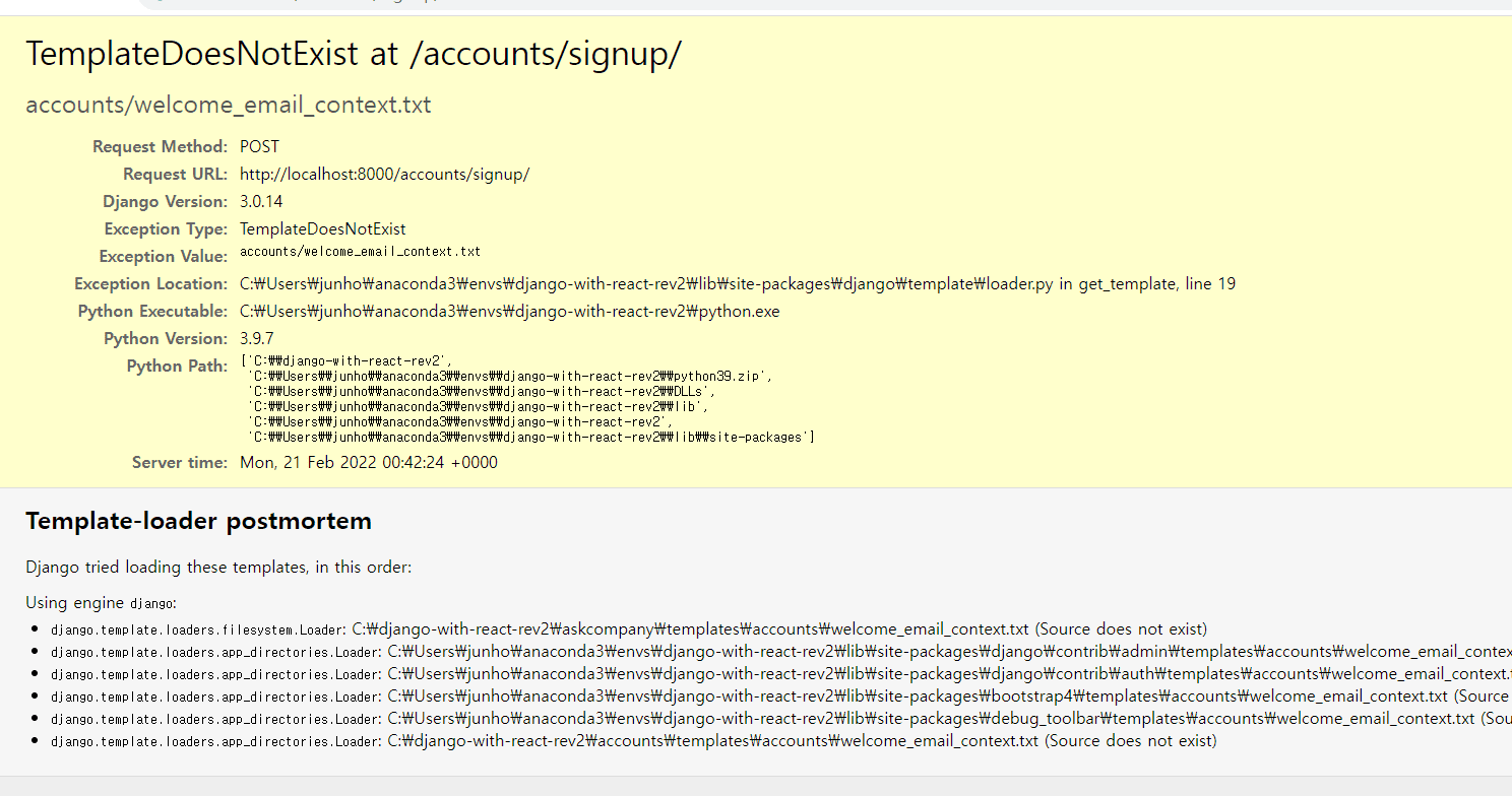 TemplateDoesNotExist 예외가 발생하시는 것은 지정 경로에 지정 이름의 템플릿 파일이 없다는 오류입니다. 폴더명/파일명에서 미묘하게 틀린 오타가 있을 수 있습니다. 차근차근 살펴보시구요. accounts/templates/accounts/ 디렉토리에 welcome_email_content.txt, welcome_email_subject.txt 파일이 있는 지 체크해보세요. 파일명/폴더명이 정확하게 일치하도록 파일이 존재함에도 TemplateDoesNotExist 예외가 발생한다면, 현재의 템플릿 경로를 장고 개발서버가 인지하지 못하고 있는 상황일 수도 있습니다. 개발서버를 중지했다가 다시 시작해보세요. :-)