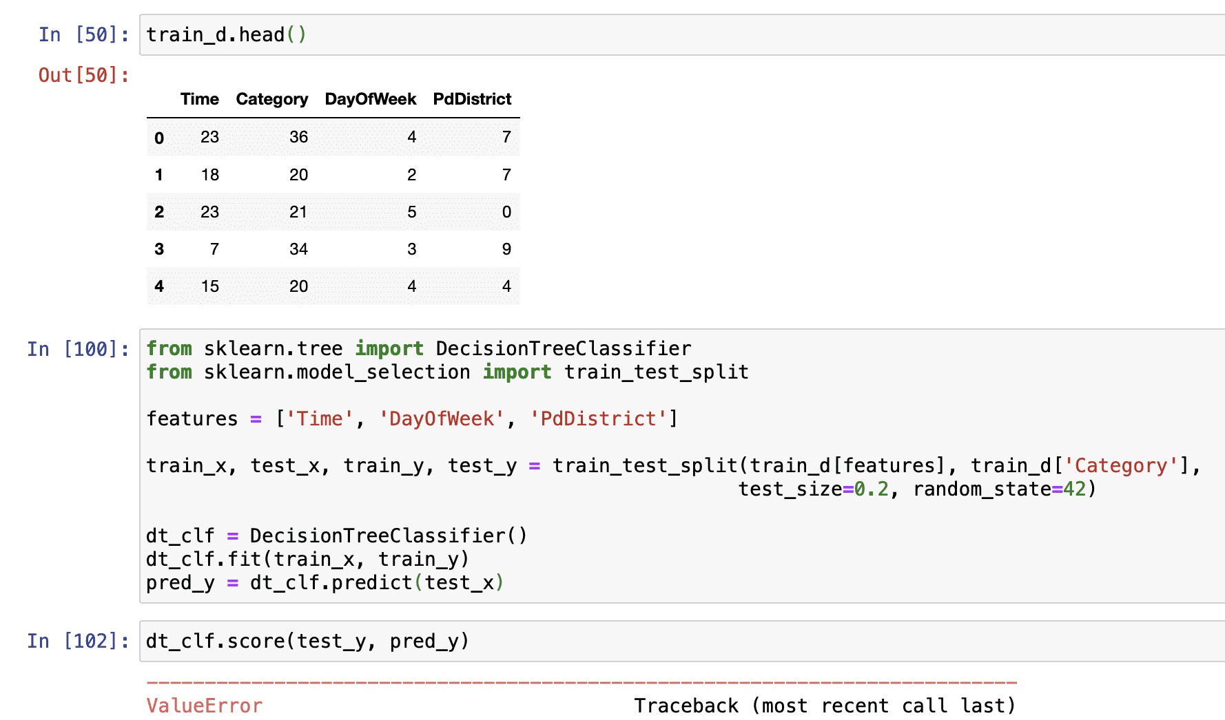 안녕하세요! 강사님 강의 중 분류 섹션들으면서 개인적으로 다른 데이터에 적용해보는 과정을 거치고 있습니다. 그런데 자꾸 이해가 되지 않는 오류가 떠서 강사님께 질문드립니다..! 우선 제가 인풋으로 집어넣을 데이터 형태는 다음과 같습니다. 예측하려는 값인 Category변수 제외하고 나머지 변수들을 sklearn의 label encoding한 상태입니다.. 그리고 100번 cell에서 학습까지 진행하는데는 문제가 없었습니다만 score 로 실제값과 예측값의 정확도를 보려고 했는데...
