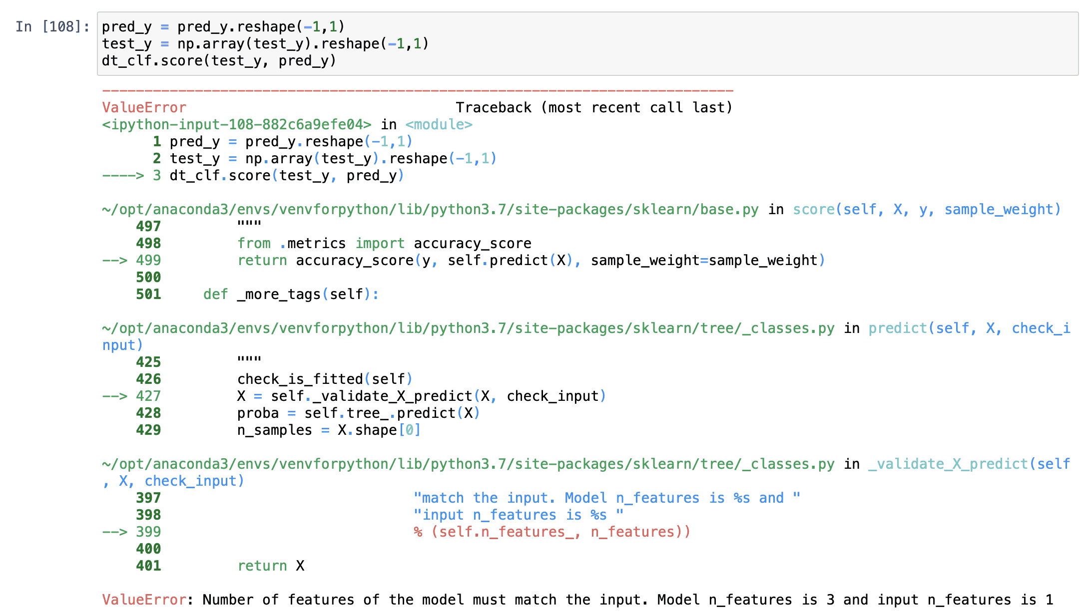 그래서 score인자에 들어가는 객체 두개의 array 차원이 서로 다른 것 같아서 reshape으로 (-1,1)형태로 동일하게 바꿔주고