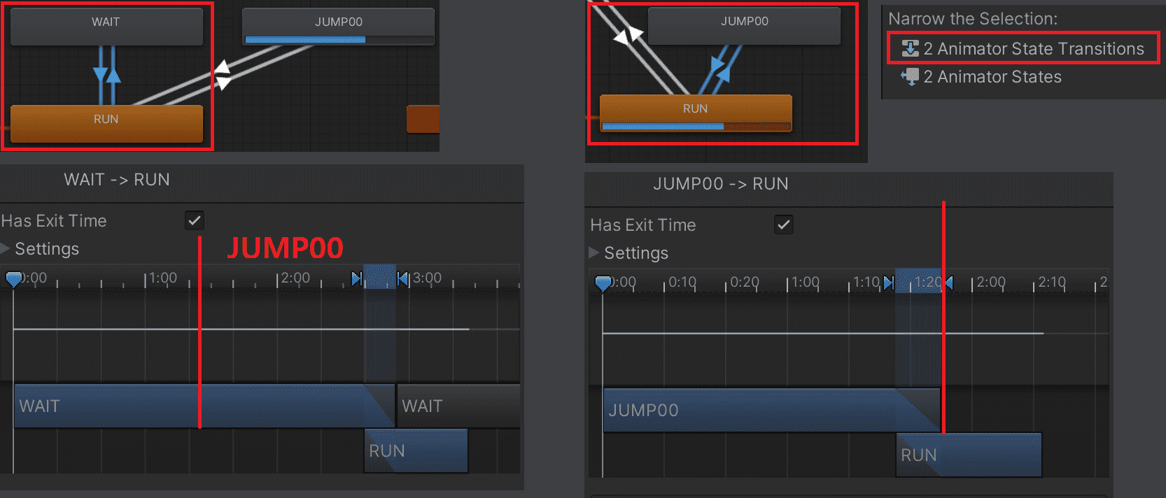 위와 같이 wait으로 변하는 시간이 jump로 변하는 시간보다 이르다면, Transitions의 순서가 어떻든 항상 wait이 먼저 실행되는 것 같습니다.