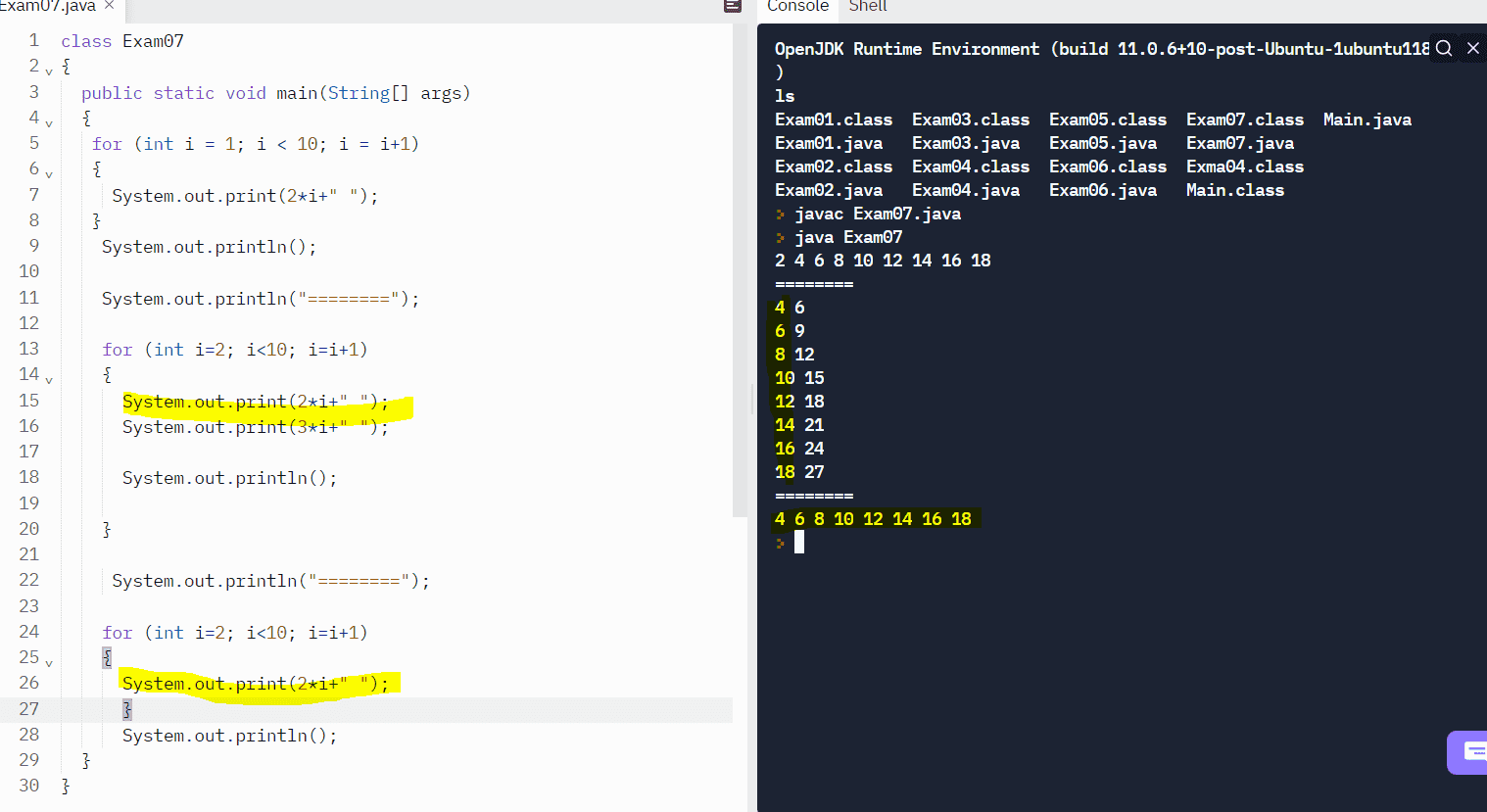 2. 동일한 for문인데 왜 처음노랑색부분은 아래로 내려가고 아래꺼는 옆으로 결과가 나오나요..?