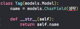 모델은 클래스로 구현하는 데요. 클래스 인스턴스에 대한 문자열 표현이 필요할 때가 있습니다. 예를 들어 인스턴스를 그대로 화면에 출력할 때 말이죠. print(tag) 와 같이요. 이때 클래스는 문자열은 아니지만 문자열 표현이 필요할 때의 동작을 정의할 수 있습니다. 이때 멤버함수 __str__ 을 정의하는 것입니다. Java에서는 toString 멤버함수를 정의합니다.