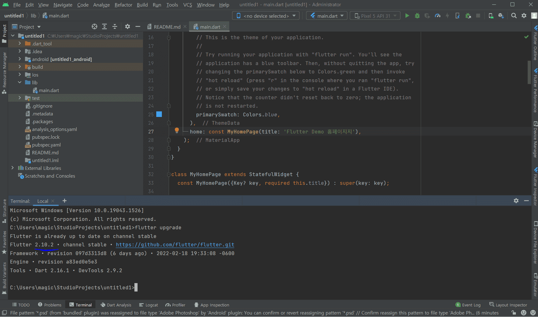 아래와 같이 터미널에서 flutter upgrade 실행시 2.2버젼으로 업그레이드가 안되고 여전히 2.10.2 버젼으로