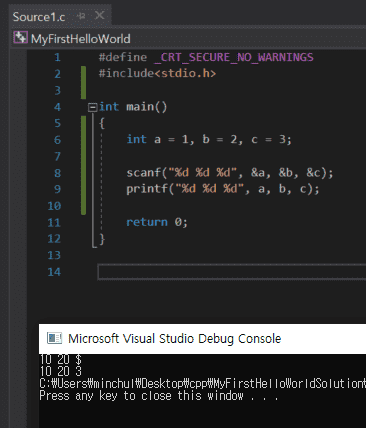 초기에 1, 2, 3으로 초기화된 a, b, c에 대해 아래와 같이 scanf에서 입력받는 첫 번째 수부터 문제를 발생시키면 당연하게도 모든 변수 (a, b, c)가 초기화되지 않습니다.