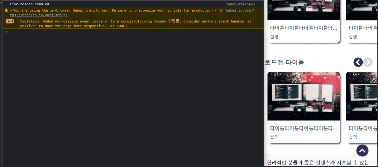 다음으로 보여주신 이미지에서 에러 메세지가 보여서, 검색을 해보았는데, 해당 부분은 경고라서, 스크립트 실행에는 문제가 없다고 해요. 그래서 브라우저 문제가 있는 것일까 살짝 의문입니다.