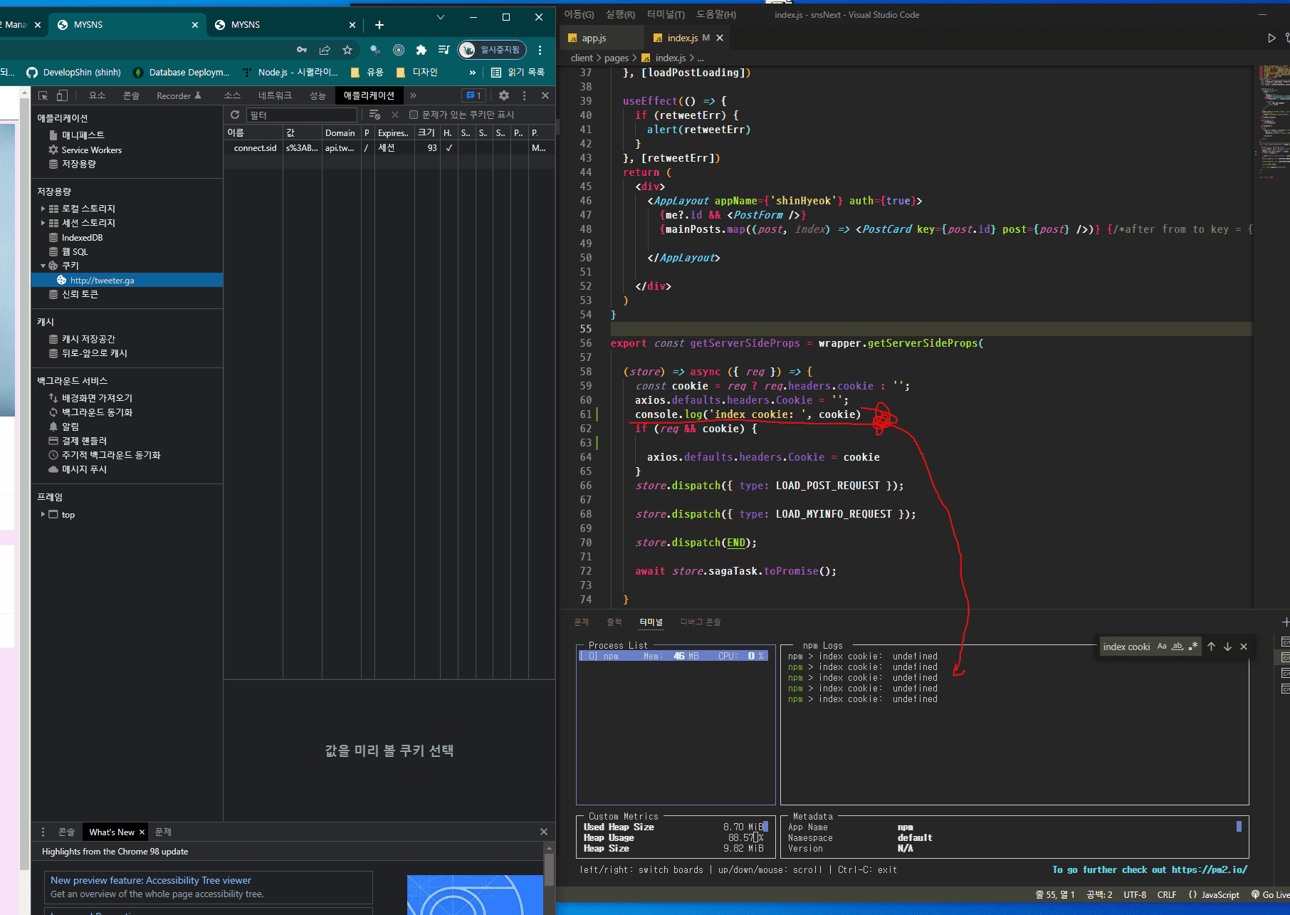로그인도 되고 포스트 작성되는데 새로고침하면 로그인이 플려버립니다. 서버에서는 유지되는데 client에서 ssr 할때 cookie전달이 안되는 것같습니다.