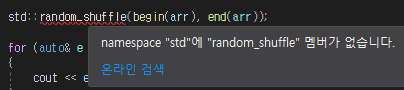 강의 내용 그대로 친 것 같은데 random 셔플부분만 std에 존재하지 않는다고 계속 에러나네요.