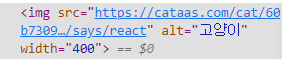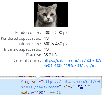그 결과 잘 나오는 것을 확인할 수 있었습니다. 혹시나 싶어 이번에는 props에 width 값 400도 추가하여 해보았습니다. 그러면 이제 props에는 img, alt, width의 값을 갖고 있게 됩니다.