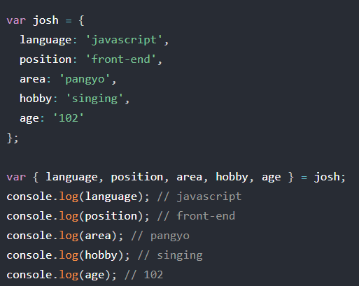 이 코드에서 var { language, position, area, hobby, age} = josh; 와 같은 코드가 있어야 디스트럭처링 문법이 실행하는 것을 개발자 도구를 통해 확인했습니다.