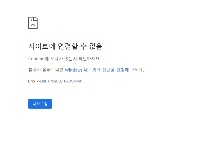 문제는 여기서 해당 url로 접속하면 헤딩url http://frontend:3000/ 로 바뀌면서 DNS_PROBE_FINISHED_NXDOMAIN이 발생합니다.