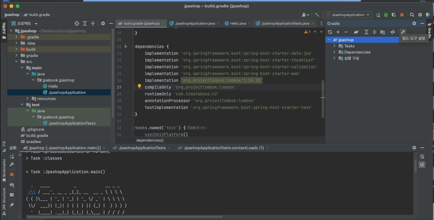 jpashop > Source Sets > main > Dependencies 으로 라이브러리를 확인하시는데