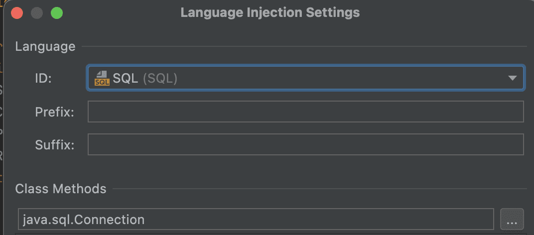 아래를 참고하여 Language injection을 sql로 바꿔주세요.