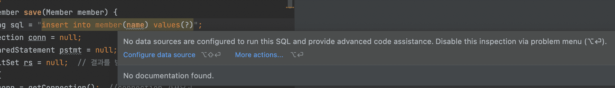 String sql이 문자열 형태가 아닌 쿼리로 인식하는 것으로 보아 인텔리제이에서 제공하는 language Injection이 세팅되어 있는 것으로 보입니다.